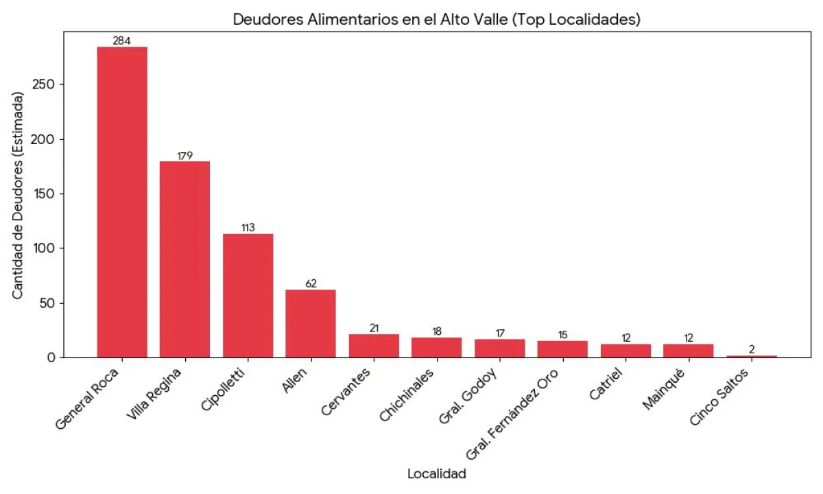 General Roca también ocupa el primer lugar en la provincia de Río Negro en cantidad de deudores alimentarios registrados. Los datos revelan una diferencia significativa respecto al resto de las localidades rionegrinas. El "top 5" provincial se configura de la siguiente manera: Roca, Villa Regina, Viedma, Cipolletti y Bariloche.