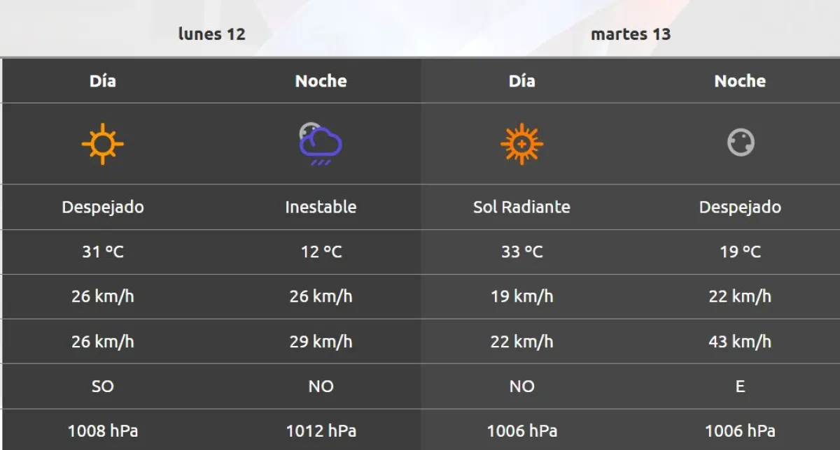 Para el martes se esperan temperaturas superiores a los 35 grados, con viento norte moderado de entre 19 km/h y 22 km/h. Al igual que el lunes, se espera que el índice de UV sea “muy alto”, por lo que se sugiere salir a la calle con lentes de sol y sombreros amplios, utilizar protector solar superior al factor 30 y tratar de exponerse lo mismo posible.