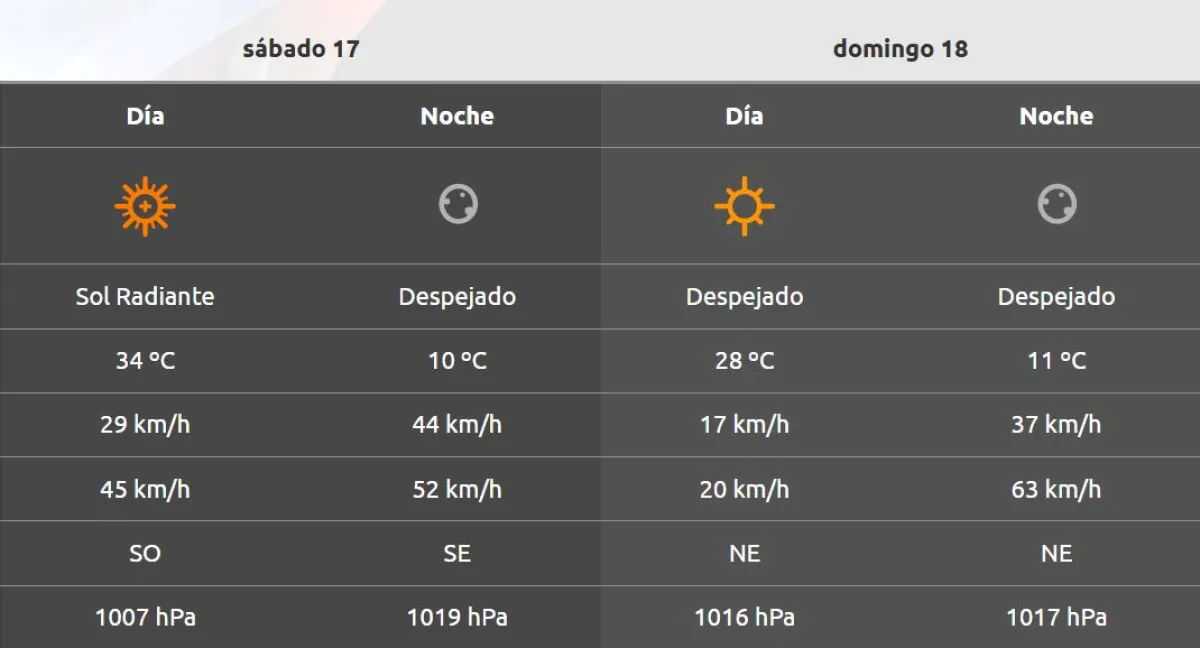 Este sábado el calor se hará sentir en la región con una jornada muy soleada, junto con el ingreso de aire del sudoeste durante todo el fin de semana. Esto traerá consigo el viento a la región, siendo durante la tarde los momentos de mayor presencia, con ráfagas de entre 52 y 63 km/h.