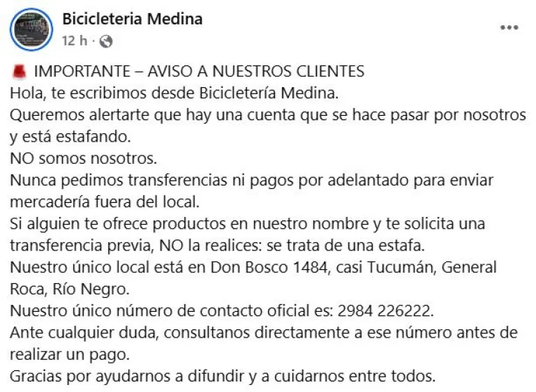 Otro local de Roca que advierte sobre estafas en redes sociales
