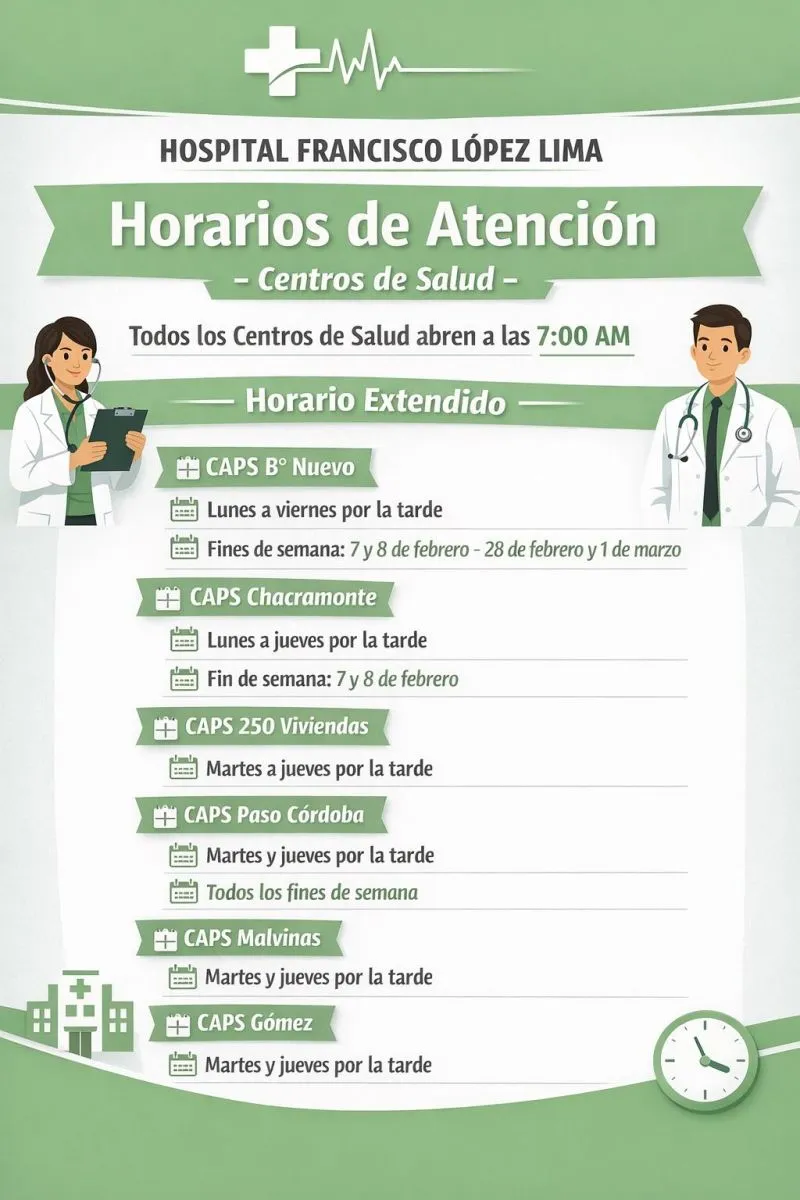 Desde el Hospital de Roca se dieron a conocer los días y horarios de atención en seis Centros de Atención Primaria de la Salud (Caps). Durante enero, funcionaron con normalidad los días de la semana y con el inicio de febrero, el cronograma fue actualizado