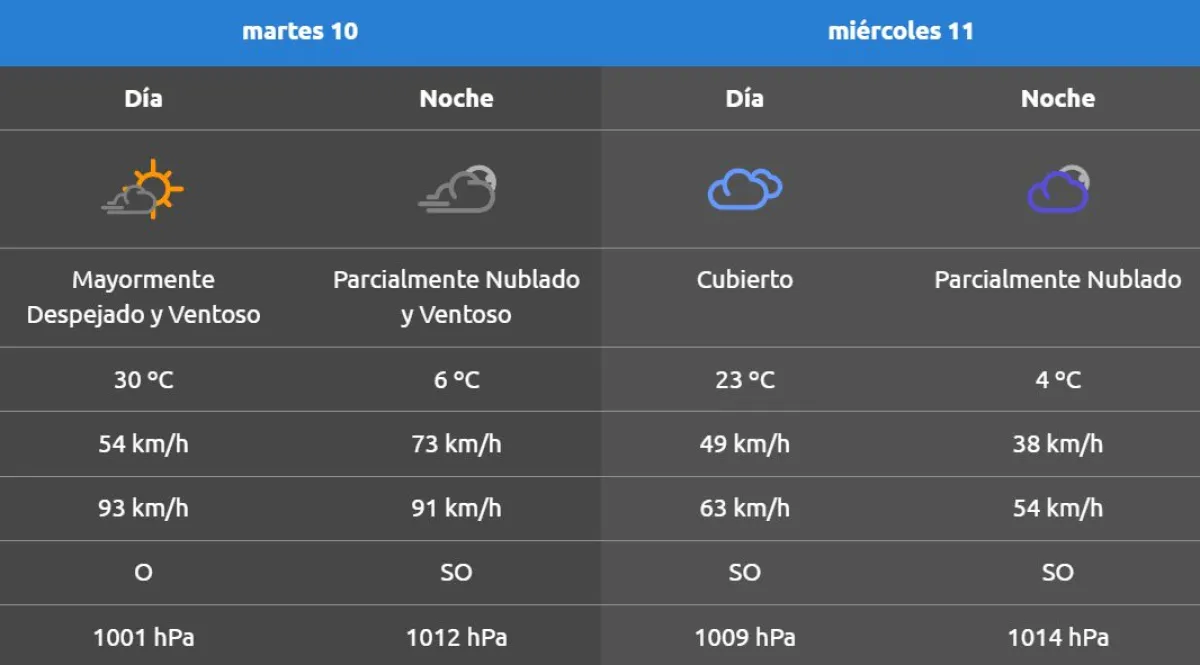 Para este martes emitieron una alerta amarilla por vientos que afectarán a toda la provincia, con velocidades entre 40 y 60 km/h y ráfagas de 90 km/h, pudiendo ser superados de manera puntual. Entre las 14 y las 15 se espera que comience el viento a aumentar hasta alcanzar velocidades de 72 km/h. El momento de mayor intensidad será a las 21.