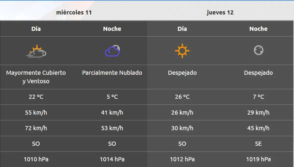 Hacia el mediodía mejoran las condiciones y por la tarde las ráfagas serán de 50 km/h, con una presencia de inestabilidad y un marcado descenso de la temperatura en lo que resta del día. Ascenso de la temperatura durante el fin de semana y comienzos de la próxima.