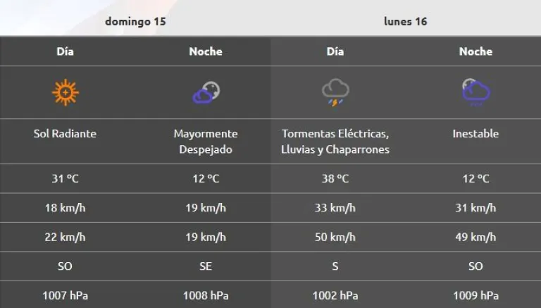 La máxima prevista para este domingo  será de 31°C con un sol radiante en el cielo que estará totalmente despejado, con vientos que podrían llegar a ráfagas de 22 km/h. Hacia la noche, la mínima rondará los 12°C, con descenso de la intensidad del viento.