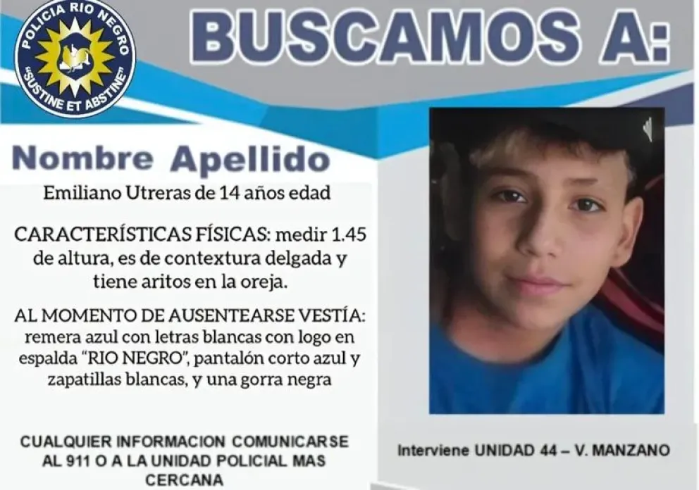 El último dato confirmado indica que el joven identificado como Emiliano Utreras de 14 años, fue visto por última vez este domingo alrededor de las 16 horas sobre la Ruta Provincial 69, a la altura de El Labrador, y se desplazaba con dirección a San Patricio del Chañar.