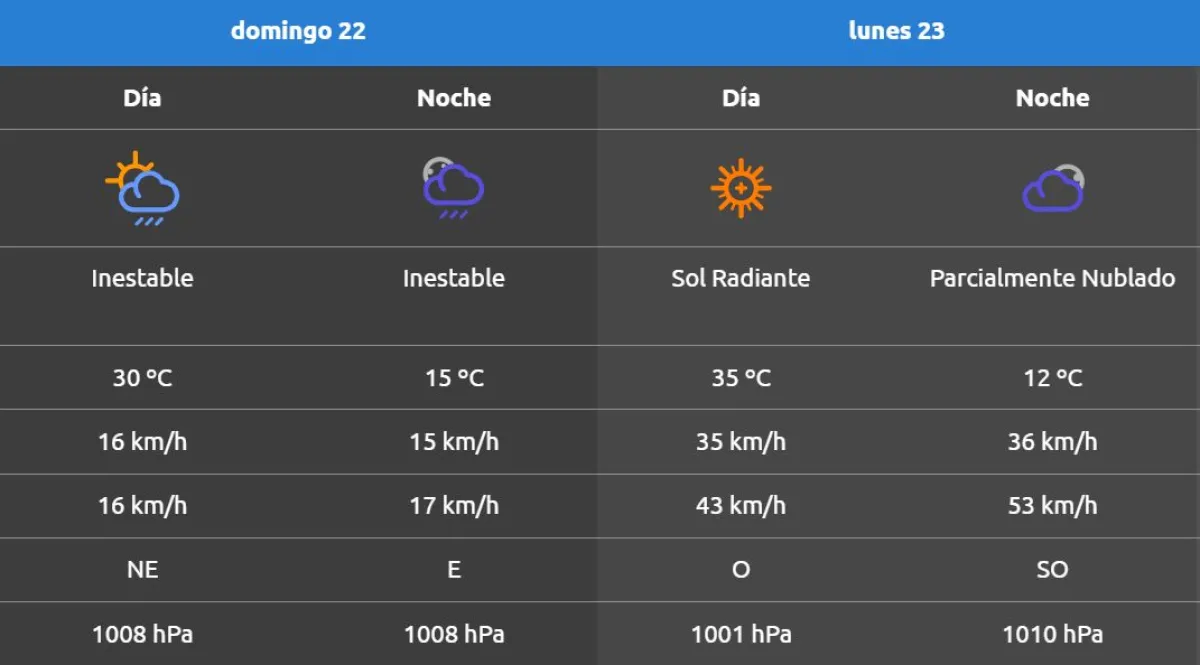 Para mañana lunes se espera que suban un poco las temperaturas hasta alcanzar los 35°, lo que va a generar un aumento del viento con ráfagas de hasta 53 km/h.