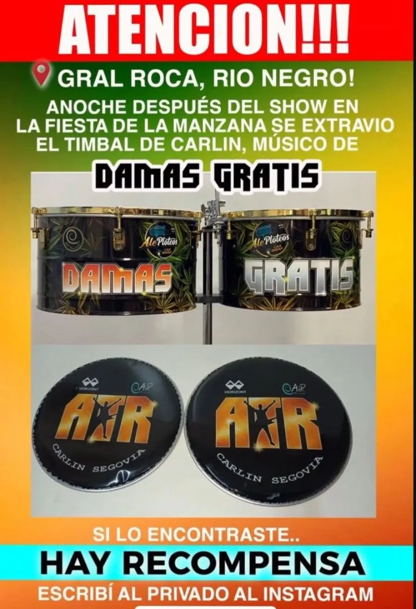 “Atención gente de Gral. Roca, Río Negro, anoche se extravió el timbal de Carlin después de la Fiesta de la Manzana. Hay recompensa, si lo encontraste escribime al privado” publicaron en redes junto a la foto del instrumento.
