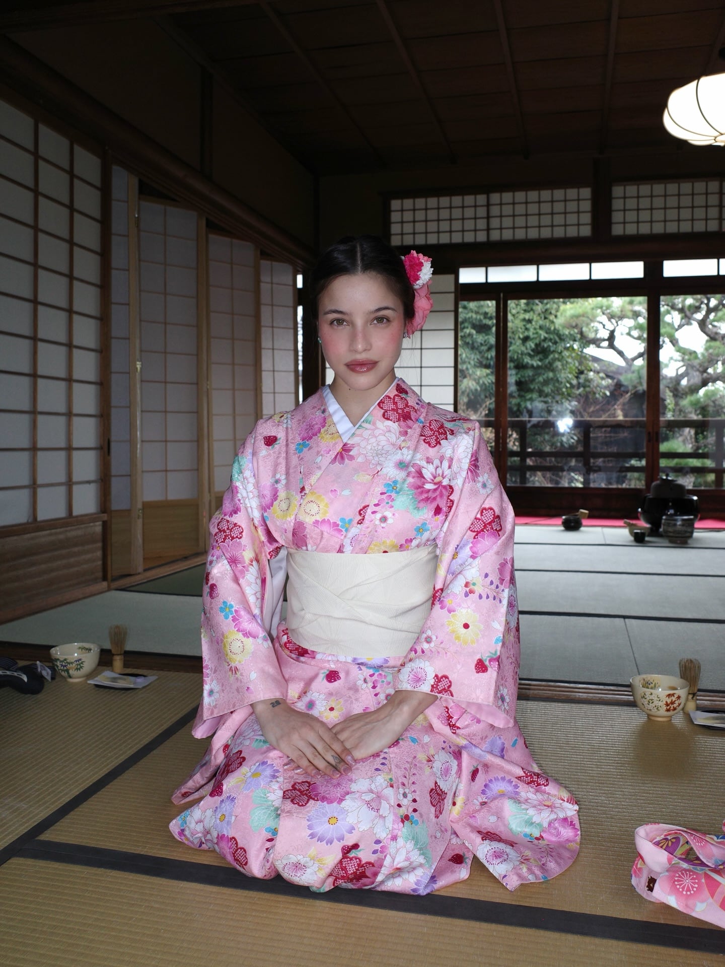 Para la ocasión, la cantante eligió un delicado kimono de seda rosa con estampas florales en tonos vibrantes. La prenda fue ajustada con un cinturón obi beige que marcó su silueta y terminó de darle al look un aire elegante y sofisticado, muy en línea con la tradición japonesa.