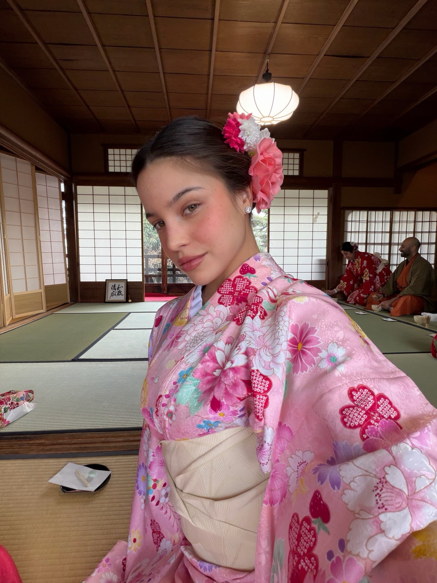Las imágenes fueron tomadas en Kioto, una de las ciudades más tradicionales del país, donde Emilia decidió vivir una experiencia cultural completa. En las postales se la ve dentro de una casa japonesa clásica, sentada sobre tatamis y rodeada de elementos típicos de la cultura nipona, en un ambiente que remite a los rituales más antiguos del país.