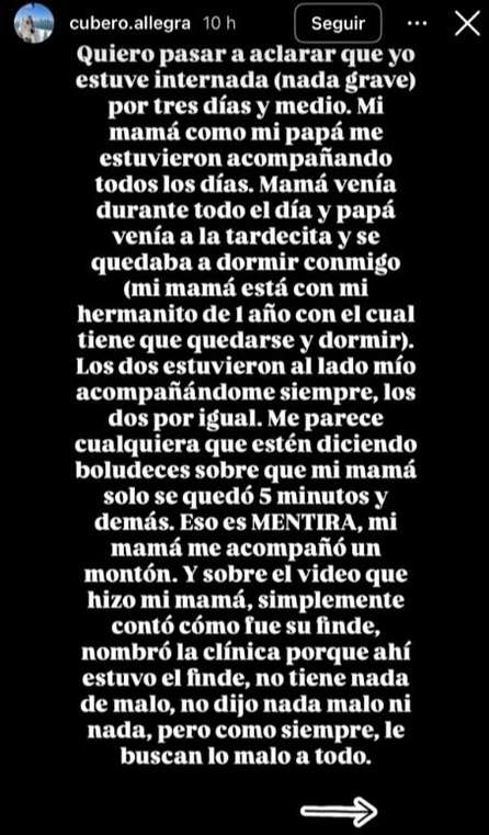 El medio elegido por Allegra para expresar la realidad de los hechos fue su cuenta de Instagram. Con un texto contundente, dejó claro que se sintió acompañada por ambos padres de manera equilibrada. Reveló cómo su madre estuvo presente durante el día, en tanto que su padre asumió las guardias nocturnas debido a las circunstancias familiares. Una declaración que no solo contradecía los supuestos informes televisivos, sino que rescataba el esfuerzo diario de ambos progenitores desde su perspectiva personal y auténtica.