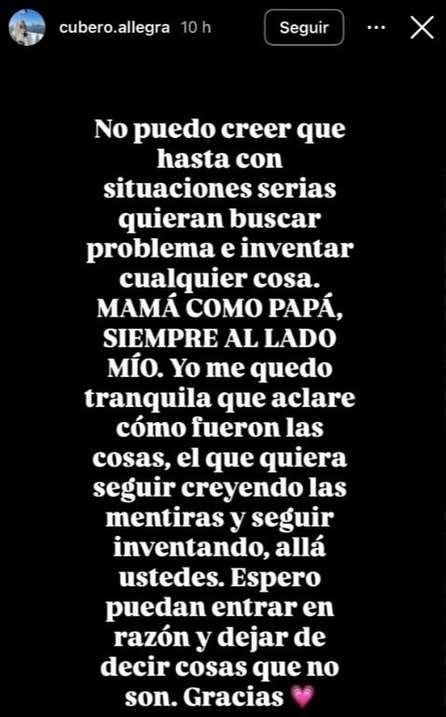 Hacia el desenlace de su comunicado, Allegra Cubero fue directa y clara, expresando su hartazgo frente a quienes aún eligen creer en las acusaciones infundadas. Remarcó que no aceptaría más mentiras y esperó que quienes especularon sobre su vida pudieran reconsiderar sus posturas. De esta manera, Allegra no solo defendió su honor y el de sus padres, sino también propuso un cierre definitivo a una controversia que nunca debió haber alcanzado tales niveles de exposición mediática.