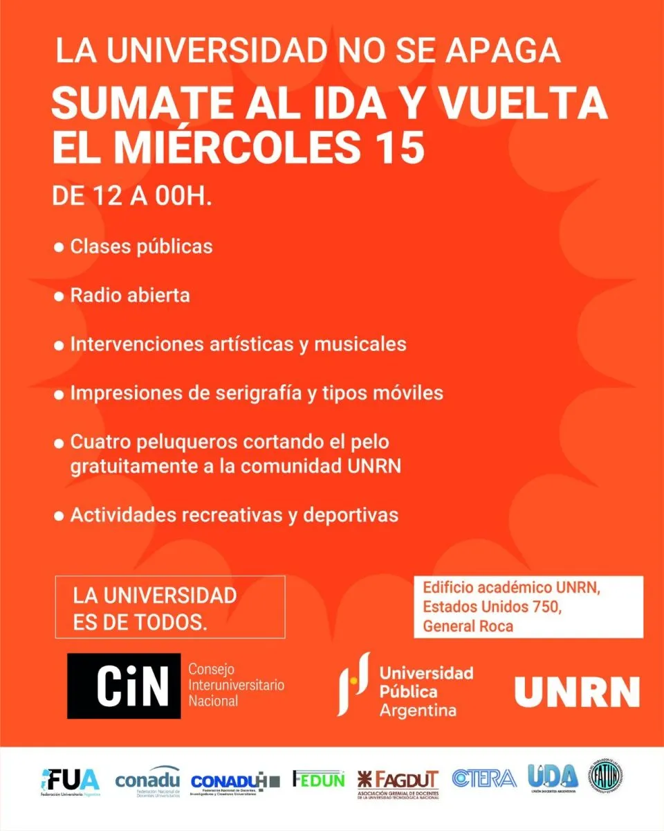 Bajo el lema "La universidad no se apaga", la sede Alto Valle y Valle Medio realizará este miércoles una jornada de 12 horas con clases públicas, radio abierta y actividades gratuitas.