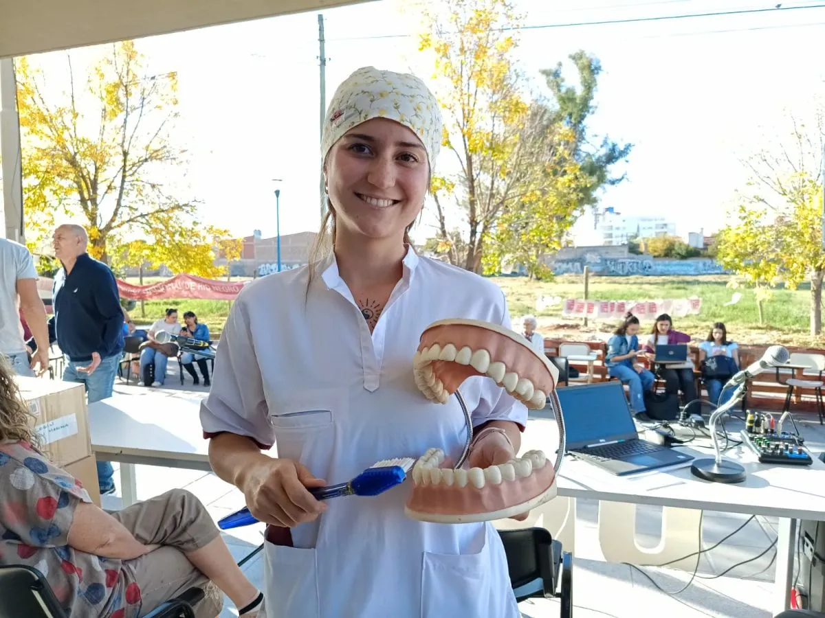 Uno de los puntos más concurridos frente al edificio fue el tráiler de Odontología, llegado desde Allen. Sofía Rubini, egresada de la carrera y parte del equipo que realiza diagnósticos y extracciones gratuitas, explicó que este tipo de dispositivos son la cara visible de la universidad en el territorio, pero también la más sensible al ajuste.