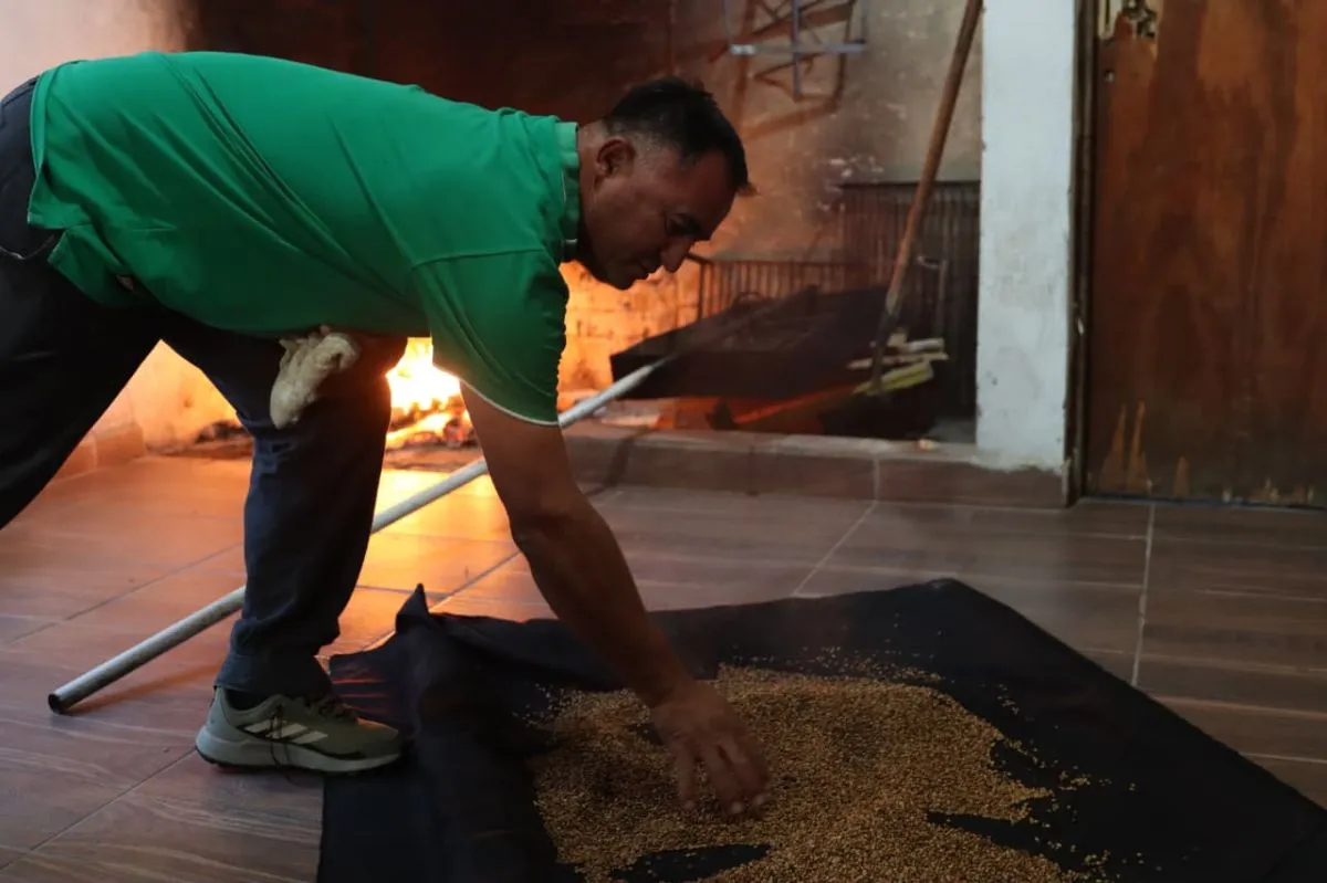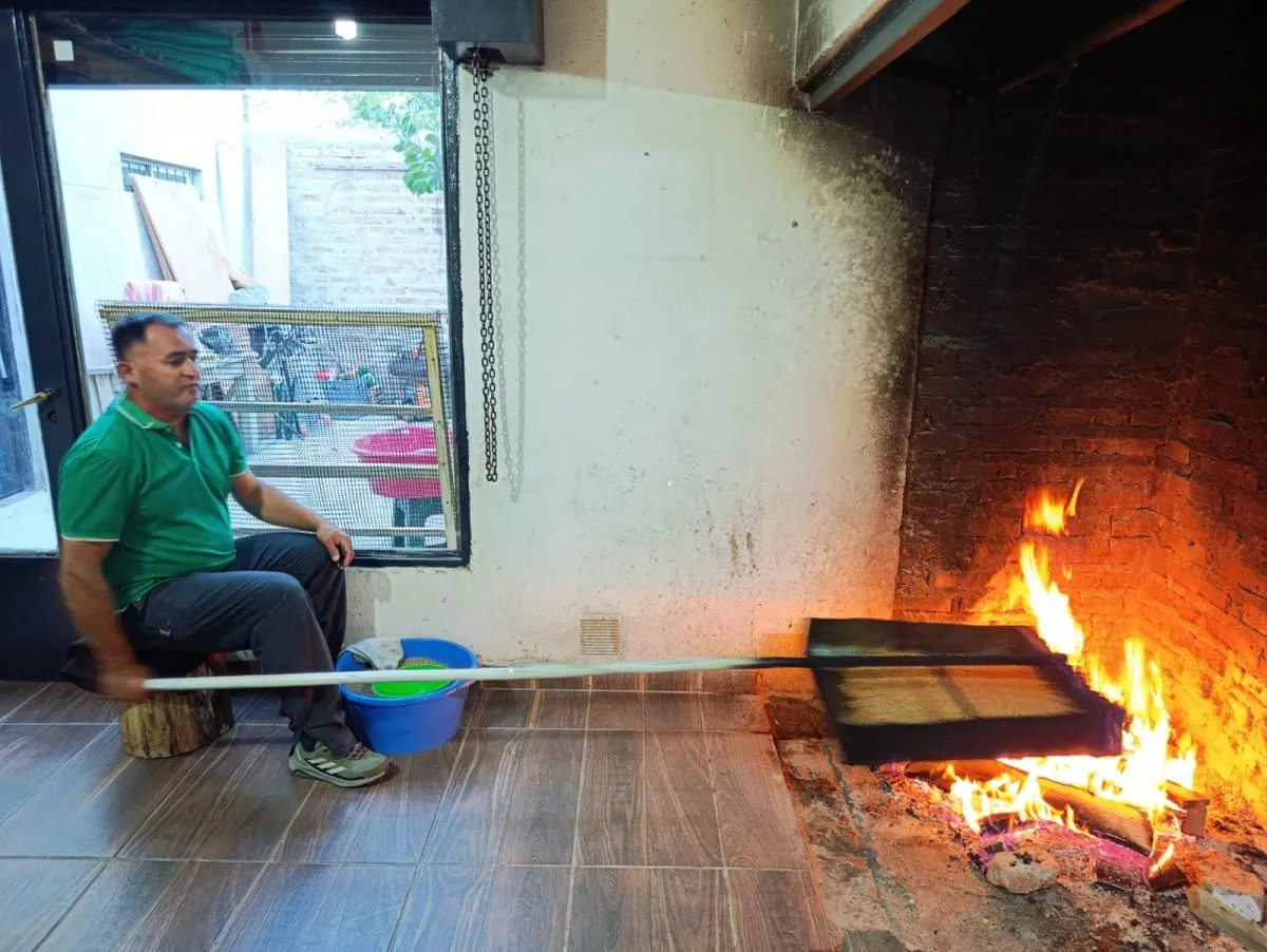 El productor explicó que se utiliza el trigo pan y detallo cada etapa del proceso. "Hago el fuego, tengo la callana, que es la que le llamamos la tostadora donde ponemos el trigo para que se toste", señaló.
